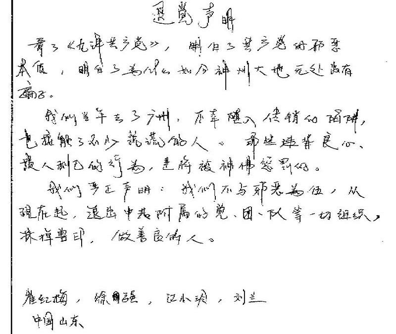 我们严正声明:我们不与邪恶为伍,从现在起,退出中共附属的党、团、队等一切组织,抹掉兽印,做善良的人。