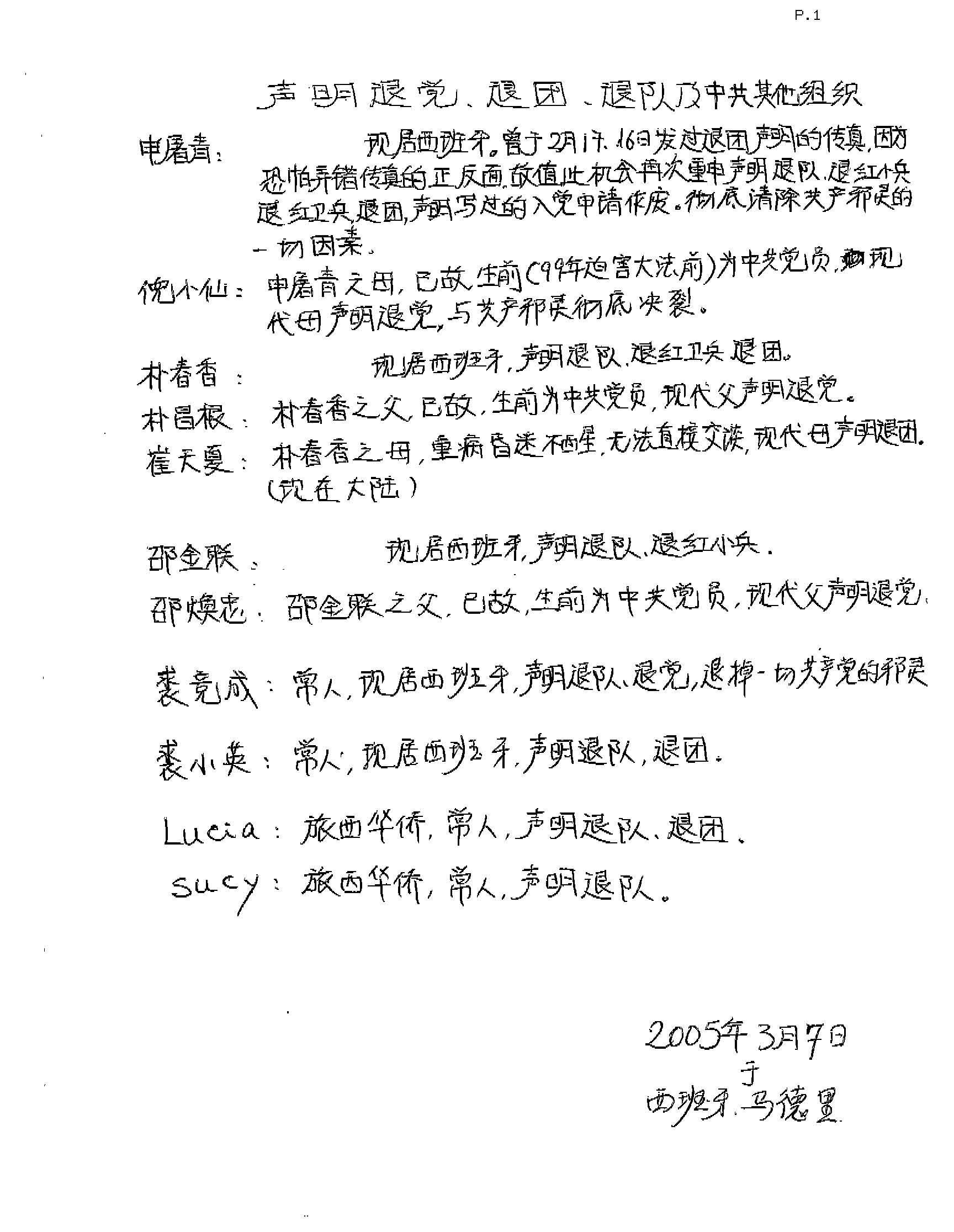 申屠青:现居西班牙。曾于2月16日发过退*团-声明的传真,因为恐怕弄错传真的正反面,故值此机会再次重申声明退*队-、退红小兵、退红卫兵、退*团-,声明写过的入党申请作废,彻底清除共产邪灵的一切因素。