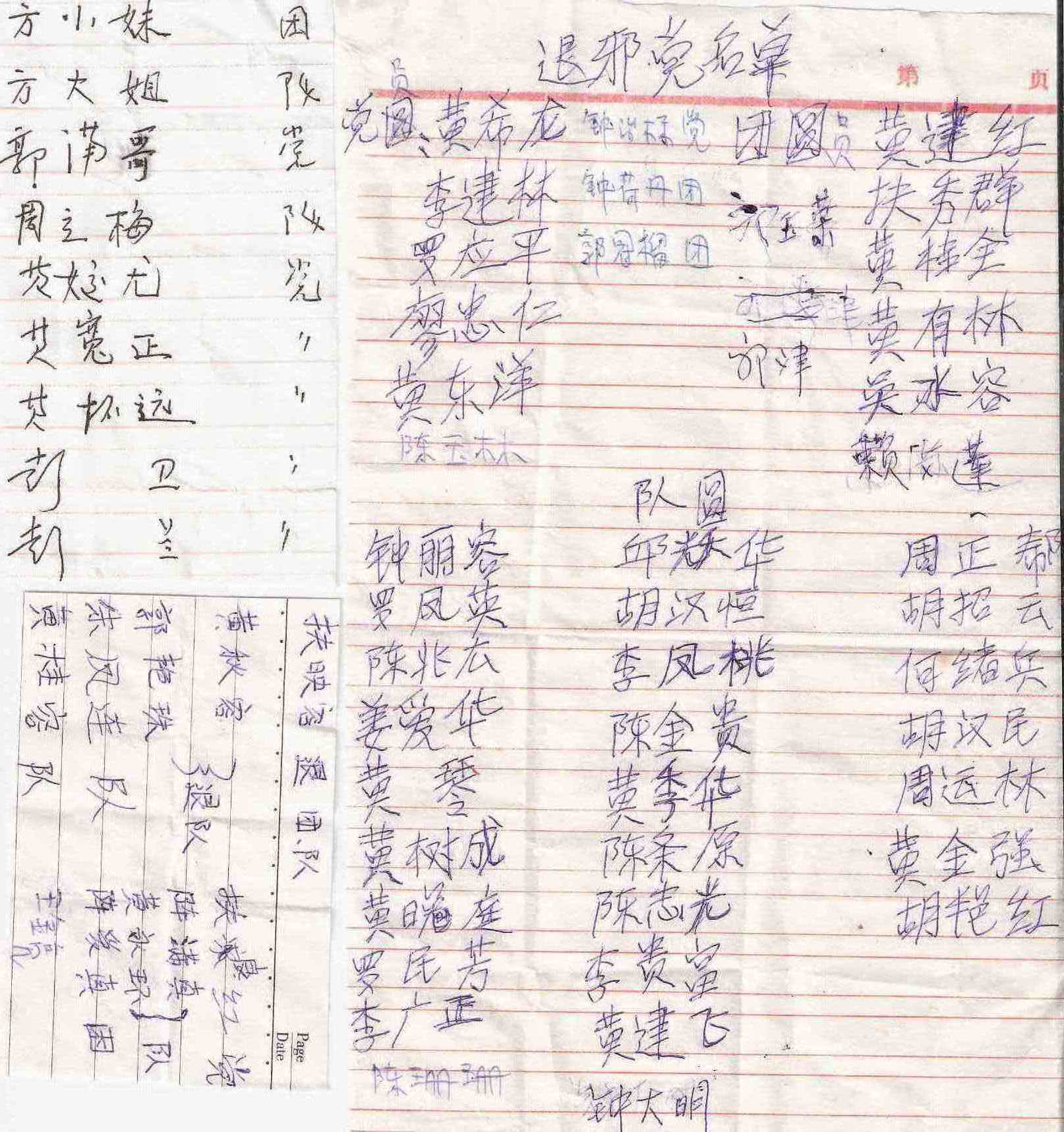 方小妹(退*团-) 方大姐(退*队-) 郭满哥(退!党!) 周立梅(退*队-) 黄姣龙(退!党!) 黄宽正(退!党!) 黄怀远(退!党!) 彭卫(退!党!) 彭兰(退!党!) 扶映容(退*团-、队) 黄秋容(退*队-) 郭艳珠(退*队-) 朱凤连(退*队-) 黄桂容(退*队-) 扶良江(退!党!) 陈满真(退*队-) 黄永环(退*队-) 陈爱真(退*团-) 王金亮(退*团-) 黄希龙(退!党!) 李建林(退!党!) 罗应平(退!党!) 廖忠仁(退!党!) 黄东洋(退!党!) 陈玉林(退!党!) 钟治标(退!党!) 钟荷丹(退*团-) 郭冠榴(退*团-) 郭玉叶(退*团-) 郭津(退*团-) 黄建红(退*团-) 扶秀群(退*团-) 黄桂全(退*团-) 黄有林(退*团-) 吴水容(退*团-) 赖满莲(退*团-) 钟丽容(退*队-) 罗凤英(退*队-) 陈兆厷(退*队-) 姜爱华(退*队-) 黄琴(退*队-) 黄树成(退*队-) 黄晚庭(退*队-) 罗民芳(退*队-) 李广正(退*队-) 陈珊珊(退*队-) 邱辉华(退*队-) 胡汉恒(退*队-) 李凤桃(退*队-) 陈金贵(退*队-) 黄季华(退*队-) 陈条原(退*队-) 陈志光(退*队-) 李贵富(退*队-) 黄建飞(退*队-) 钟大明(退*队-) 周正帮(退*队-) 胡招云(退*队-) 何绪兵(退*队-) 胡汉民(退*队-) 周运林(退*队-) 黄金强(退*队-) 胡艳红(退*队-)