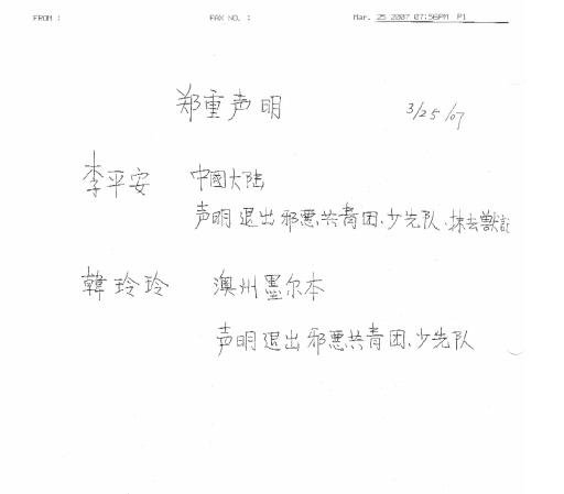 韩玲玲,澳州墨尔本,声明退出邪恶共青团、少先队