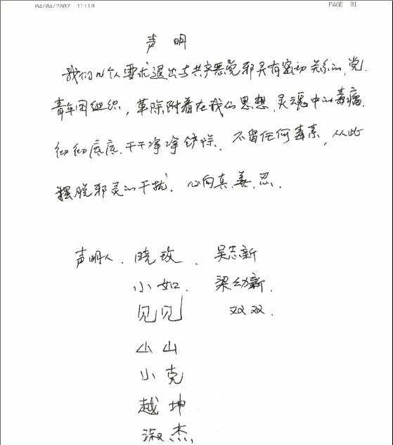 我们几个人要求退出与共产恶党邪灵有密切关系的党、青年团组织,革除附着在我们思想、灵魂中的毒瘤,彻彻底底、干干净净铲除,不留任何毒素,从此摆脱邪灵的干扰,心向真、善、忍。