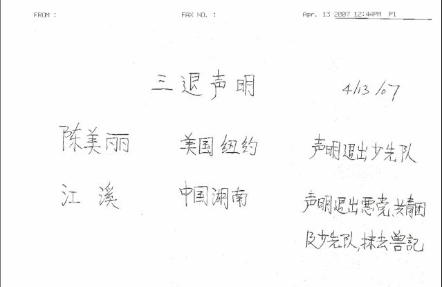 江溪 中国湖南 声明退出恶党、共青团及少先队,抹去兽记