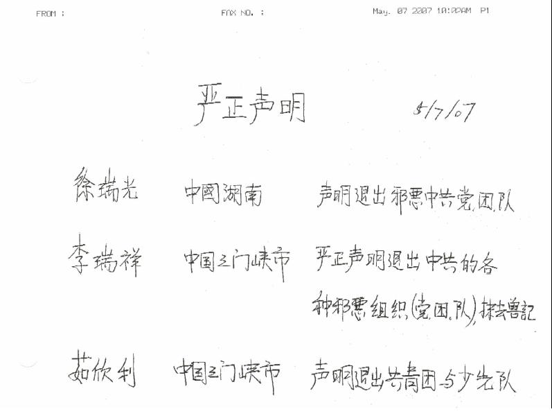 徐瑞光 中国湖南 声明退出邪恶中共党、团、队