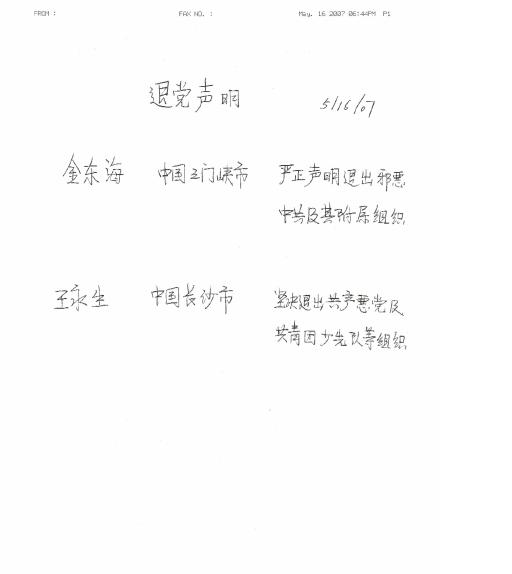 王永生 中国长沙市 坚决退出共产恶党及共青团少先队等组织。
