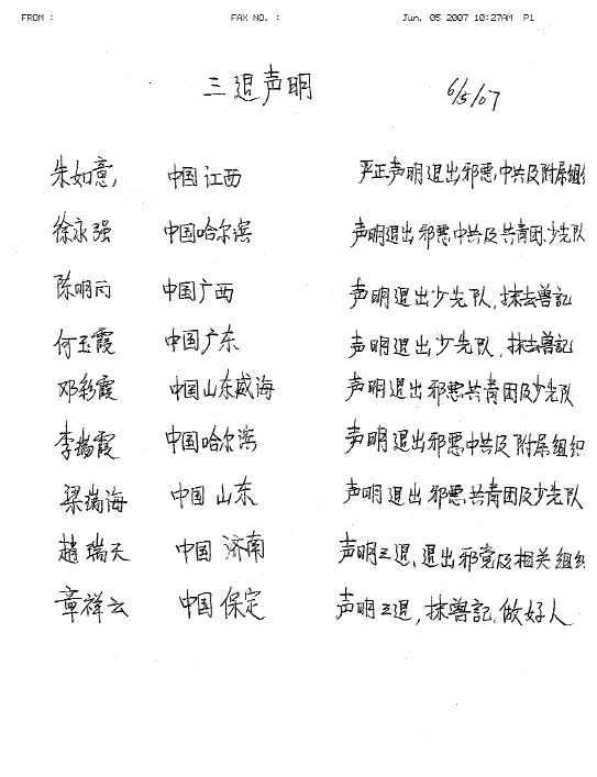 梁瑞海 中国山东 声明退出邪恶共青团及少先队。