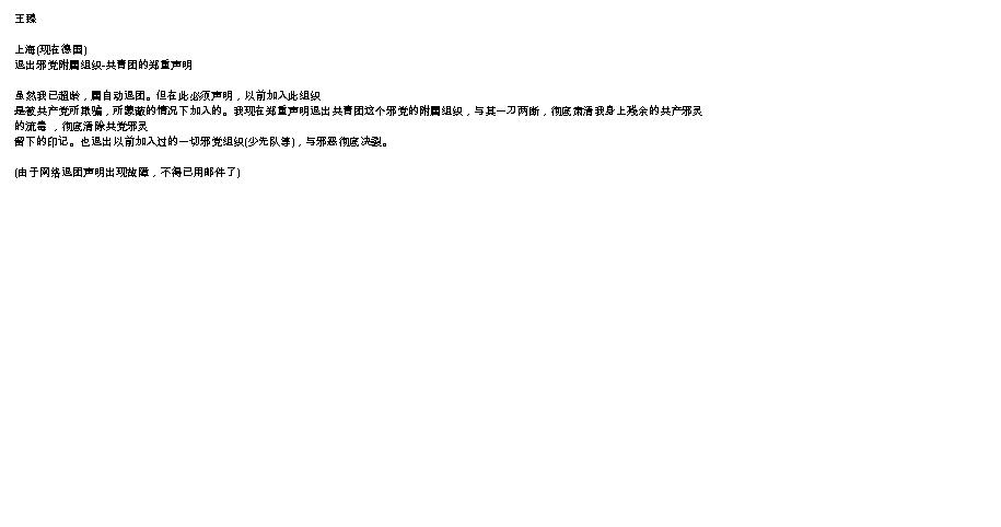 。但在此必须声明,以前加入此组织是被共产党所欺骗,所蒙蔽的情况下加入的。我现在郑重声明退出共青团这个邪