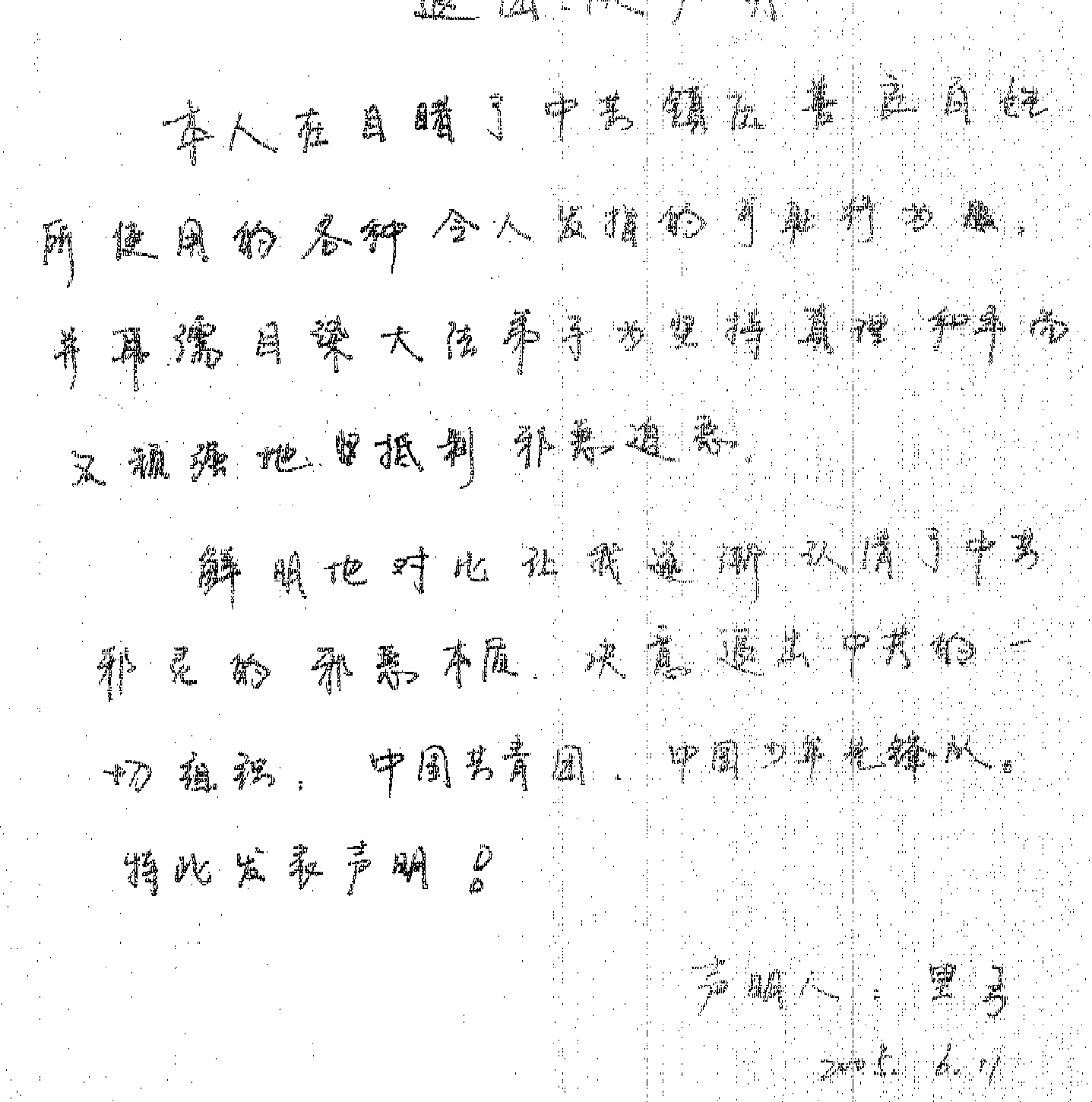 本人在目睹了中共镇压善良百姓所使用的各种令人发指定的可恶行为后,并耳濡目染大法弟子的真诚和平而又坚强地抵制邪恶的迫害,鲜明地对比让我看清理中共邪灵的邪恶本质,决意退出中共的一切组织:中国共青团,中国少年先锋队,特此发表声明!