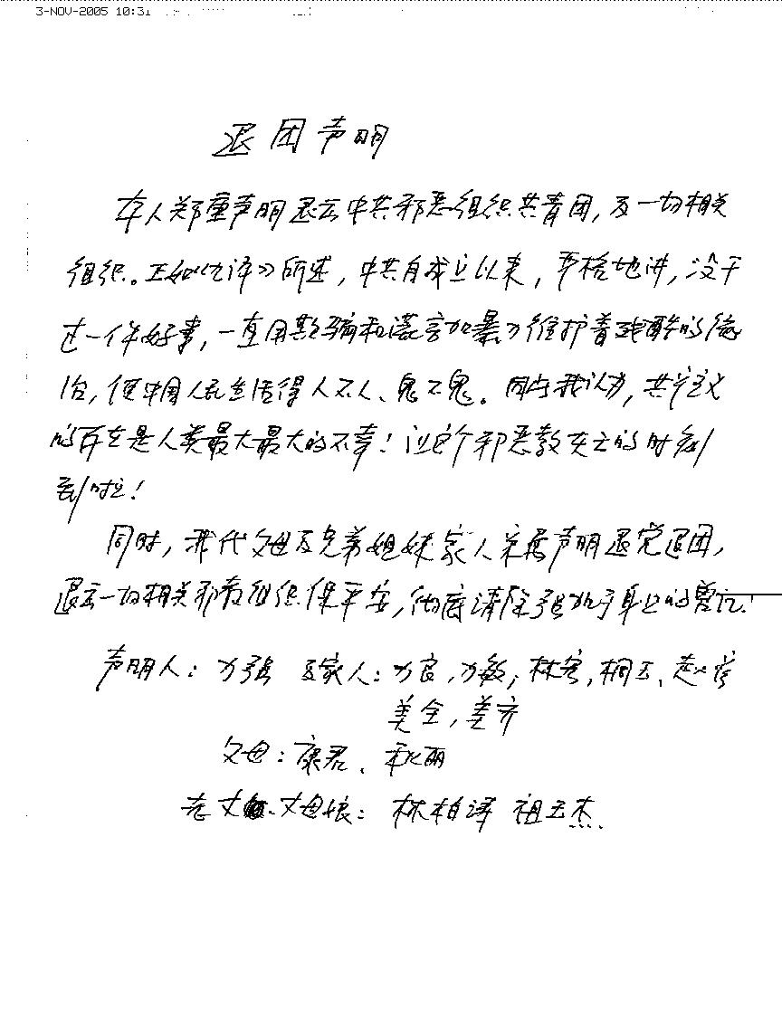 本人郑重声明退出中共邪恶组织共青团,及一切相关组织。正如《·九·评*》所述,中共自成立以来,严格地讲,没干过一件好事,一直用欺骗和谎言加暴力维护着残酷的统治,使中国人民生活得人不认,鬼不鬼。因此我认为,共产主义的存在是人类最大最大的不幸!让这个邪恶教灭亡的时刻到啦!